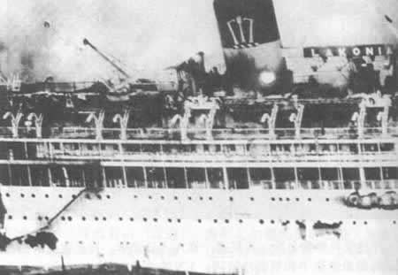 浓烟仍笼罩着内部烧毁了的“拉柯尼亚”号的舱上部分